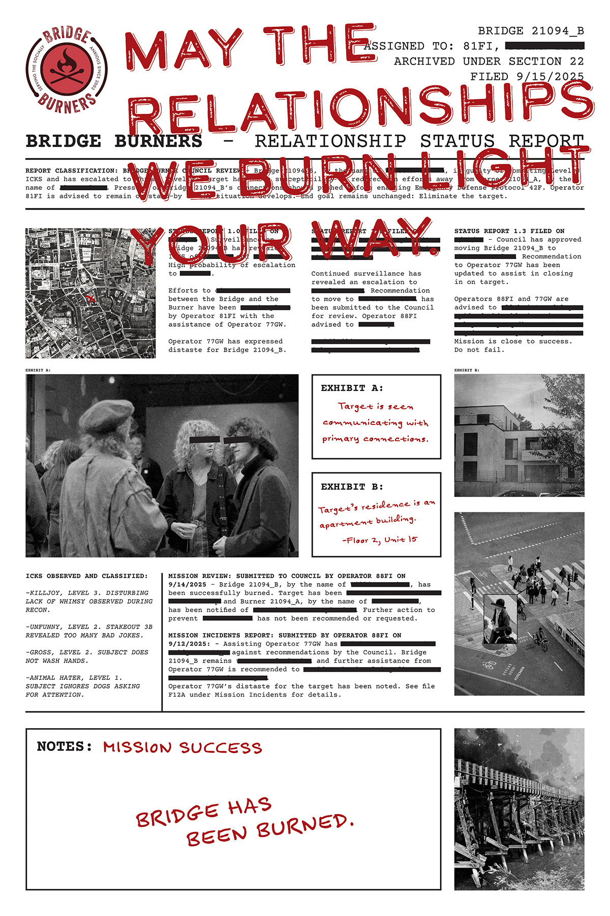 *Bridge Burners is not legally liable for any emotional or bodily harm that may befall the chosen target.