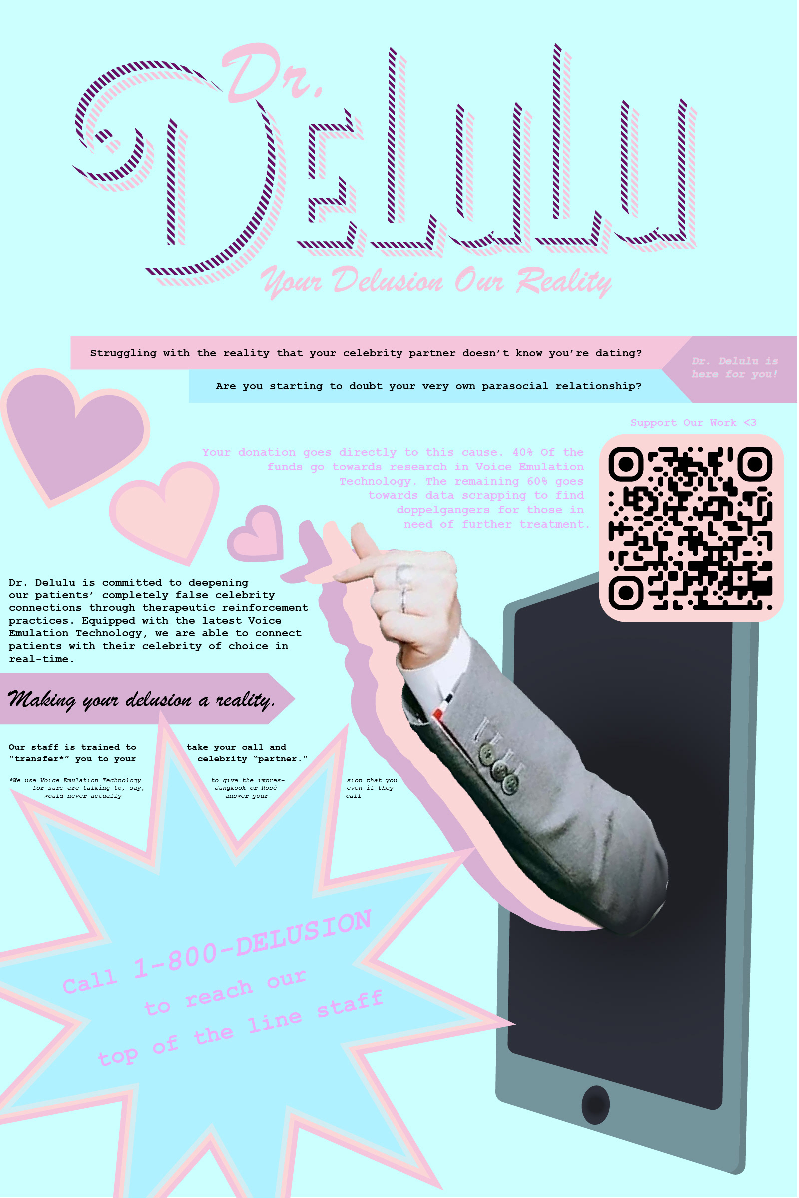 Dr. Delulu is committed to deepening our patients’ completely false celebrity connections through therapeutic reinforcement practices. Equipped with the latest Voice Emulation Technology, we are able to connect patients with their celebrity of choice in real-time. Making your delusion a reality.